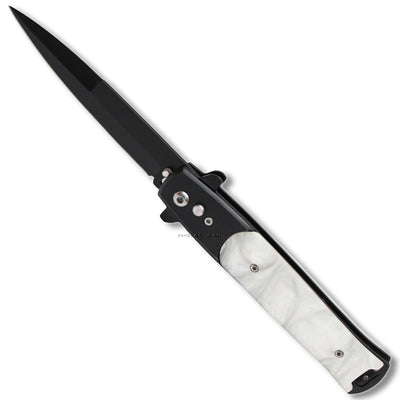 FPSTACTICAL Agate Italian Style Stiletto Switchblade Black with White Pearlex / Marble Inlays 4"