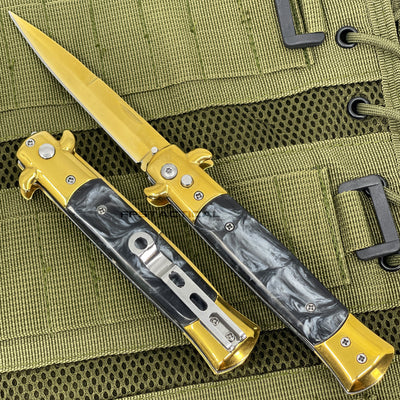 FPSTACTICAL Pallid Italian Style Stiletto Switchblade Gold with Black Marble / Pearlex Inlays 4"