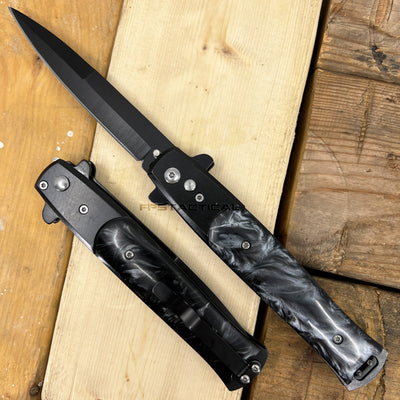 This FPSTACTICAL Taonga is a 9" Italian style stiletto switchblade that features a classic stiletto look with black marble accents. The 440C stainless spear point blade is finished in black with black pearlex scales making for a timeless look. It features automatic push button / button lock operation and also features a blade safety lever that can be used to keep the blade permanently locked when needed. Both the frame and removable pocket clip are stainless steel and finished in satin black with chrome hardware providing a nice contrast. The pocket clip and locking mechanism help to make this an excellent EDC (Everyday Carry) knife.
