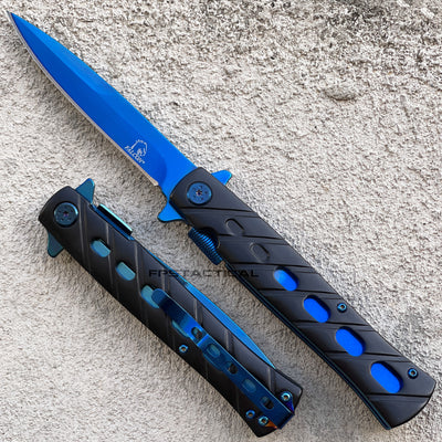 Falcon KS1108BB Black and Blue Mirror Finish Grooved Handle Spring Assisted Stiletto Knife 4"