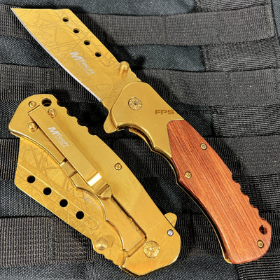 MTech USA Cleaver Spring Assisted Pocket Knife with Gold Blade and Wood Handle MT-A1050GD