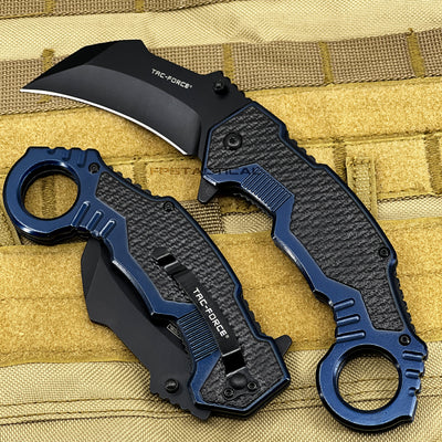 Tac-Force Blue & Black Karambit Spring Assisted Tactical Knife w Glass Breaker & Rubberized Grip 3"