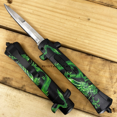 FPSTACTICAL Tarragon Automatic OTF Switchblade Stiletto Knife Black w/ Green Dragon / Mirror Polish 3.75"