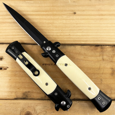 FPSTACTICAL Alabas Italian Style Stiletto Switchblade Black w White Ivory Pearlex Scales 4"