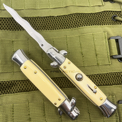 The FPSTACTICAL Argent is a 9" bolster lock Italian style switchblade featuring a classic stiletto look complete with a 440C Stainless steel curved Kris blade and frame featuring White Ivory / Pearlex Scales. It features automatic push button operation with a blade safety lever integrated into the scales that can be used to keep the blade permanently locked when needed. Both the frame and bayonet style single edged blade are polished to a mirror finish which give it a very elegant timeless look. A nylon carrying case with belt loop is also included making this an excellent choice for those wanting to use this as an EDC (everyday carry) knife.