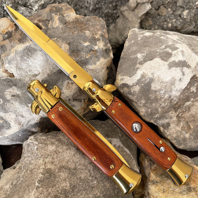 FPSTACTICAL Aurous Italian Style Stiletto Switchblade Mirror / Gold with Pakkawood Scales 4"