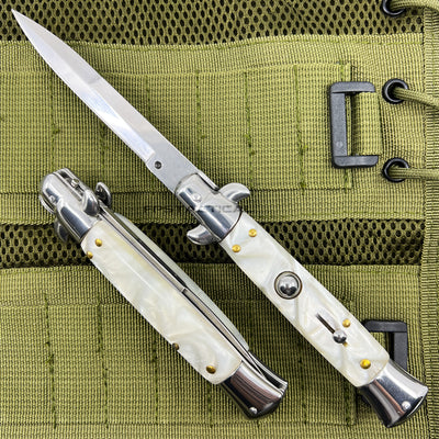The FPSTACTICAL Perolado is a 9" bolster lock Italian style switchblade featuring a classic stiletto look complete with a 440C stainless steel blade and frame featuring White Faux Marble / Pearlex Scales. It features automatic push button operation with a blade safety lever integrated into the scales that can be used to keep the blade permanently locked when needed. Both the frame and bayonet style single edged blade are polished to a mirror finish which give it a very elegant look. A nylon carrying case with belt loop is also included making this an excellent choice for those wanting to use this as an EDC (everyday carry) knife.