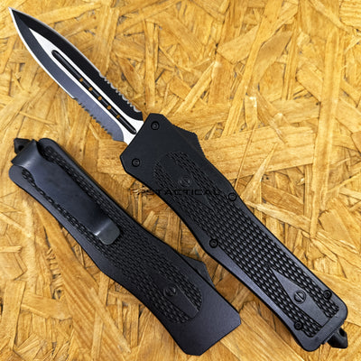 FPSTACTICAL Pitch Dual Edge Spear Tip OTF Knife Black & Silver Two Tone w Partial Serrated Blade and Diamond Texture Aluminum Handle 3.75"