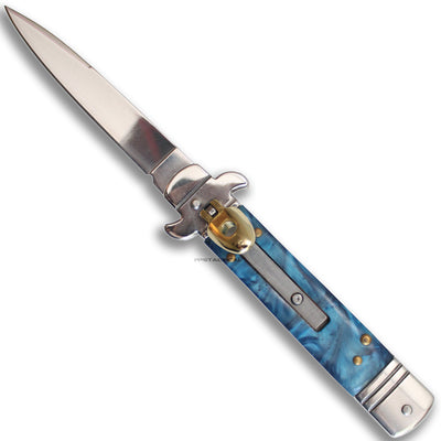 The FPSTACTICAL Cerulean is a 9" lever lock Italian style switchblade featuring a classic stiletto look complete with a 440C stainless steel blade and frame featuring faux blue pearlex / marble scales. It features automatic lever lock operation with the lever able to be closed to prevent premature opening and closing. Both the frame and bayonet style single edged blade are polished to a mirror finish which give it a very elegant look.