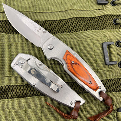 Elk Ridge Brushed Silver Manual Folding Pocket Knife w Redwood Overlay 3.5" ER-933PW