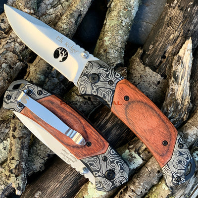 Elk Ridge Silver Manual Folding Pocket Knife w Damascus Bolster Etching and Wooden Inlays 3.5"