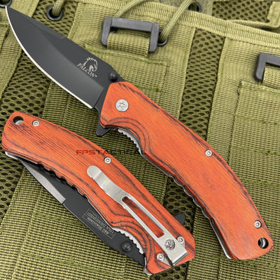 The Blade and Handle of this spring assisted knife both feature Stainless Steel Construction while the Blade also features 440C Stainless Steel providing the longevity and durability found in some of the most expensive cutlery while offering Excellent Resistance to the Elements. The Black 3.5" Razor Sharp Drop Point style blade adds an aggressive undertone which when combined with the Wooden Scales creates an unparalleled classic look. Add to all this, a Handy Removable Pocket Clip as well as a robust reliable Liner Lock and you have a knife that is perfectly suited for many tactical and rescue situations but can also serve perfectly for all around daily tasks.