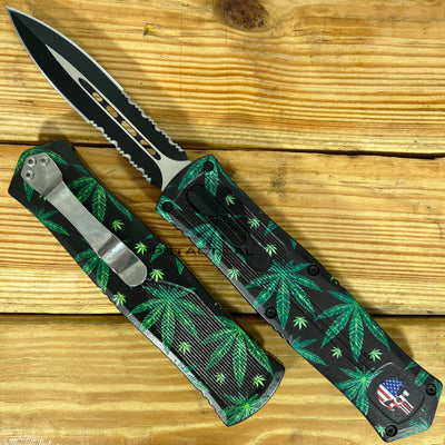 FPSTACTICAL Vigilante Black and Silver Double Serrated OTF Knife with Marijuana and Punisher Print 3.5"