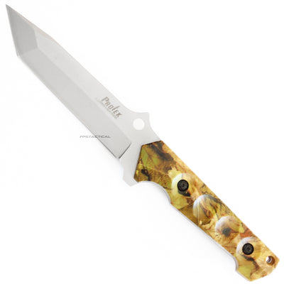 The 10.5" full tang fixed blade razor sharp Tactical Knife made by Protek is not for the timid! The 5" tanto style blade is made of 440 Stainless Steel providing the longevity and durability found in some of the most expensive cutlery. The stainless steel full tang handle has a glass breaker edge built into the butt with woodland camouflage polymer ABS scales that are riveted into place. This stainless steel fixed blade full tang / camouflage ABS combination maximizes reliability and resiliency to the elements while also blending into a forest environment making it a great buy for hunters and fisherman. The included nylon sheath with a belt loop and snap lock makes for an easy carry and the fixed blade requires no maintenance other than sharpening.