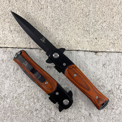 Falcon Compact Satin Black on Brown Pakkawood Spring Assisted Stiletto Knife 3"