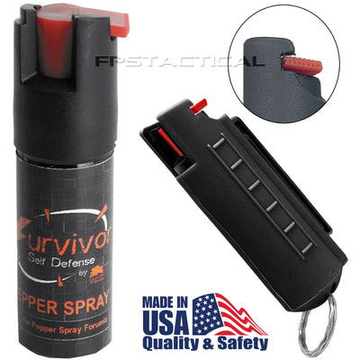 The Survivor Self Defense is 1/2 ounce pepper spray in 18% OC (Oleoresin Capsicum or known as "red pepper")and is Made and Laboratory Tested in the USA to Ensure Quality and Safety in a No-Leak Design with a Safety Switch that Optimizes Efficiency.  Paired with a Black Hard Shell Holster & keychain with twist-top makes it quickly accessible when needed - just twist and shoot! Small, mini, and compact to fit in your purse, pocket and on your keychain.