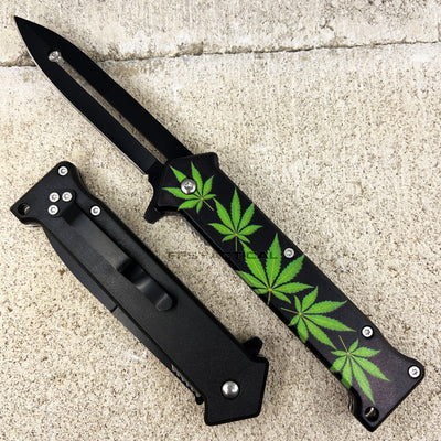 This Marijuana themed spring assisted knife by Pacific Solutions is equipped with a 3.5" single-edged stiletto spear style 440C Stainless Steel blade with a blood groove cutout which provides the longevity, durability, and corrosion resistance found in some of the most expensive cutlery! It also features a durable stainless steel frame with Marijuana Leaf ABS polymer scales which provides a secure, lightweight grip and a menacing yet artistic look. Add to all this, a handy / removable pocket clip and you have a knife that is that is conveniently suited to most tasks with an expressive overtone.