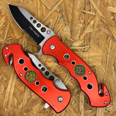 Tac-Force Fire Fighter Spring Assisted Tactical Rescue Knife w/ Glass Breaker & Seat Belt Cutter Red & Black 3.25"