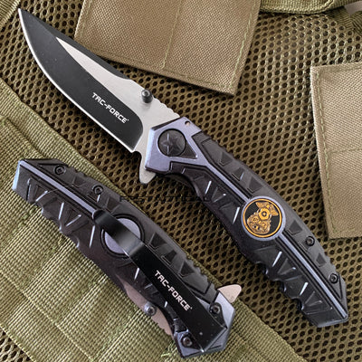 Tac-Force Police Shield Drop Point Spring Assisted Tactical Rescue Knife Black & Blue 4"