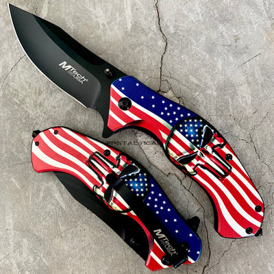 MTech USA Flag Textured 3D Punisher Skull Spring Assisted Knife Red / White / Blue & Black KS-A1025A 3.75"