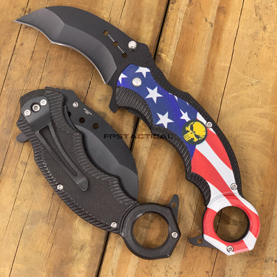 Pacific Solutions USA Flag Punisher Skull Spring Assist Karambit Knife Black Textured Polymer G10 Scales 2.75"