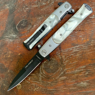 Tac-Force Black and White Pearlex 440 Stainless Steel Stiletto Spring Assisted Knife