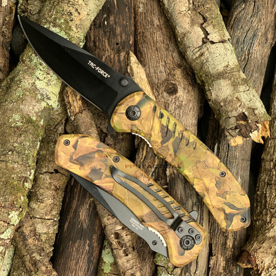 Tac-Force Spring Assisted Hunter Knife Black w Forest Camouflage and Grooved / Contour Grip 3.5"