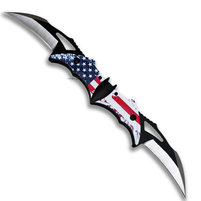 This American Flag Bat Wing spring assisted knife by Pacific Solutions is equipped with Dual 4.5" single-edged drop point 440C Stainless Steel blades which provides the longevity, durability, and corrosion resistance found in some of the most expensive cutlery! It also features a durable Stainless Steel Frame with American Flag Print ABS Polymer Scales which provides a secure, lightweight grip with a uniquely American look. Add to all this, a handy / removable pocket clip and you have a knife that is that can not only be used as an EDC (everyday carry) but also expresses your USA pride.